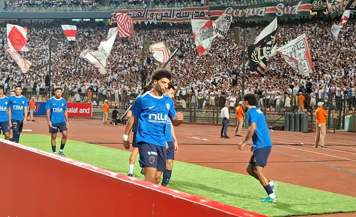 عمرو ناصر مهاجم الزمالك يغني مع الجماهير اثناء عمليات الأحماء في مباراة القمة