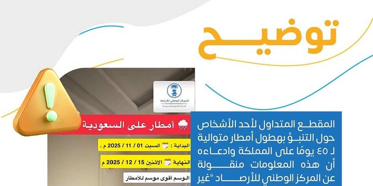 نفى المركز الوطني للأرصاد صحة المقطع المتداول لأحد الأشخاص، الذي تحدث فيه عن توقعات بهطول أمطار متوالية لمدة 45 يومًا على مناطق المملكة، مدعيًا أن تلك المعلومات منقولة عن المركز، مؤكدًا أن ما ورد في المقطع غير صحيح ولا يستند إلى أي مصادر رسمية.