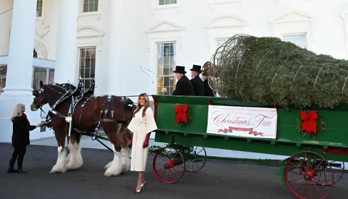 أطلقت السيدة الأولى ميلانيا ترامب موسم العطلات لعام 2025 رسميًا يوم أمس الإثنين، باستقبال شجرة عيد الميلاد الخاصة بالبيت الأبيض. ووقفت ميلانيا أمام الشجرة، وهي من نوع التنوب الأشهب Concolor Fir ويبلغ ارتفاعها نحو 7 أمتار، وقد وصلت من ولاية ميشيغان على متن عربة تجرها الخيول.