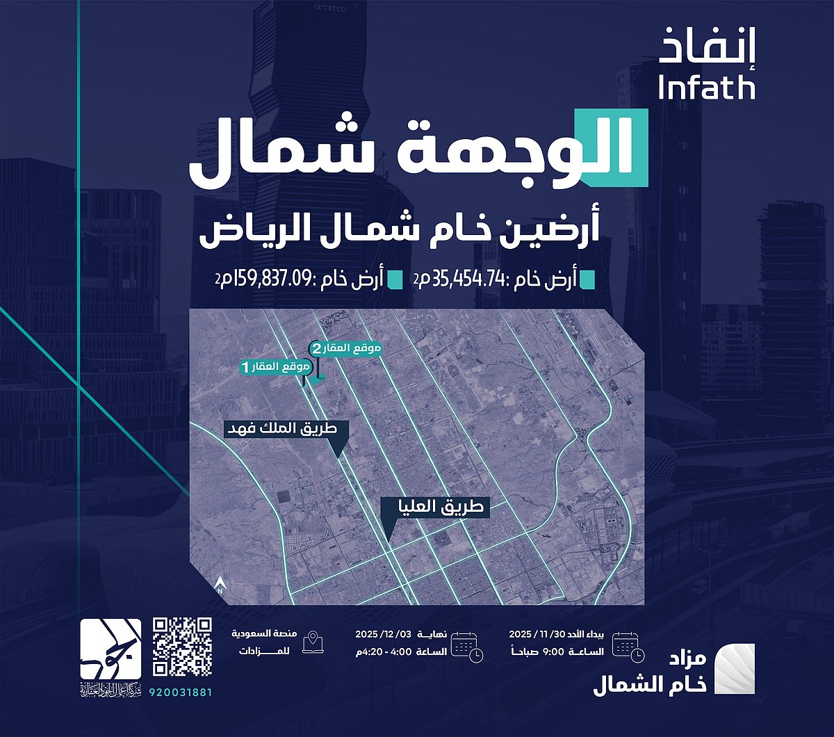 تعلن شركة أعمال الجود العقارية وبإشراف مركز الإسناد والتصفية «إنفاذ» وبحكم من محكمة الأحوال الشخصية ، عن إقامة مزاد ” خام الشمال” الإلكتروني عبر منصة السعودية للمزادات بدءًا من يوم الأحد ٣٠ / ١١ / ٢٠٢٥م وينتهي يوم الأربعاء ٣ / ١٢ / ٢٠٢٥م من الساعة ٤:٠٠ وحتى ٤:٢٠ عصرًا بعون الله.