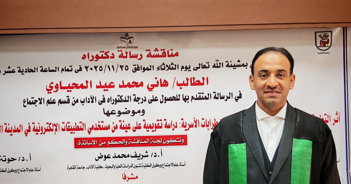 حصل الأخصائي الأول الاجتماعي بالمركز الطبي في جامعة طيبة، هاني محمد المحياوي، على درجة الدكتوراه في تخصص علم الاجتماع من جامعة القاهرة، بتقدير ممتاز مع مرتبة الشرف.